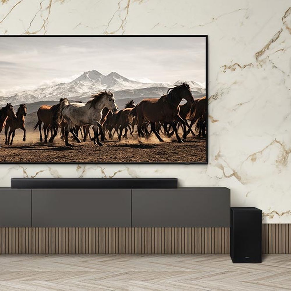 Built-in side speakers enhance the surround sound experience, while Adaptive Sound optimizes audio based on the content you’re watching. Game Mode enhances sound effects for gaming, while Voice Enhance Mode ensures clear dialogue for movies and shows. With Bluetooth Multi-Connection, you can pair multiple devices and switch between them seamlessly.