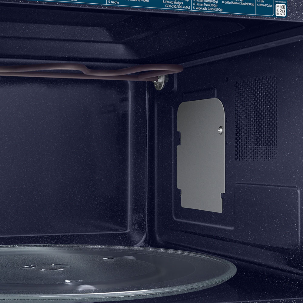 The Samsung 40L Grill Microwave Oven combines modern aesthetics with practical functionality to meet your diverse cooking needs. Its elegant silver finish and user-friendly LED display complement any kitchen decor, while the spacious 40-liter capacity accommodates larger dishes and family-sized meals. Equipped with a powerful grill function, it allows you to prepare crispy and browned dishes effortlessly. The Power Defrost feature enables quick and even thawing of frozen foods, preserving their freshness and nutritional value. The Ceramic Enamel Interior offers a durable, scratch-resistant surface that is easy to clean and maintains its color over time. Additionally, the microwave features a Triple Distribution System, ensuring that heat is evenly distributed for thorough and consistent cooking results. With multiple power levels and a range of auto-cook programs, it provides versatility and convenience for a variety of cooking tasks.