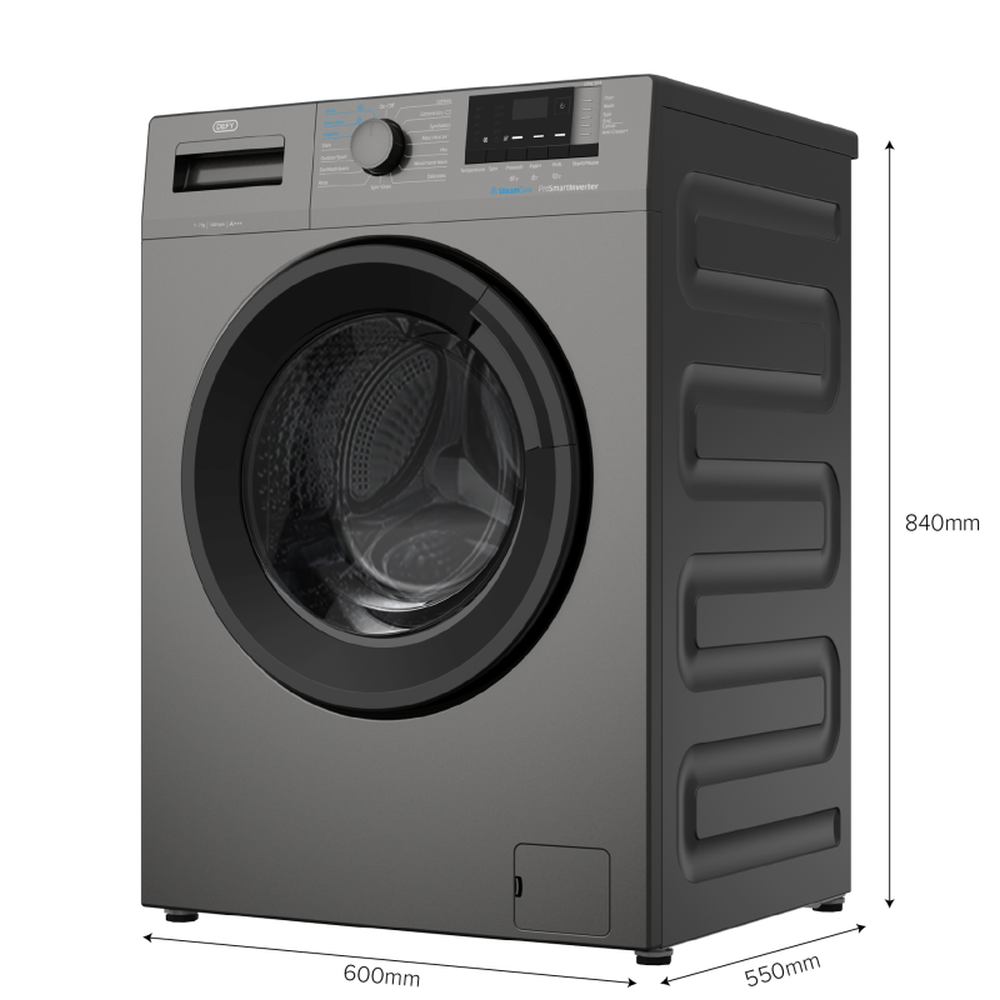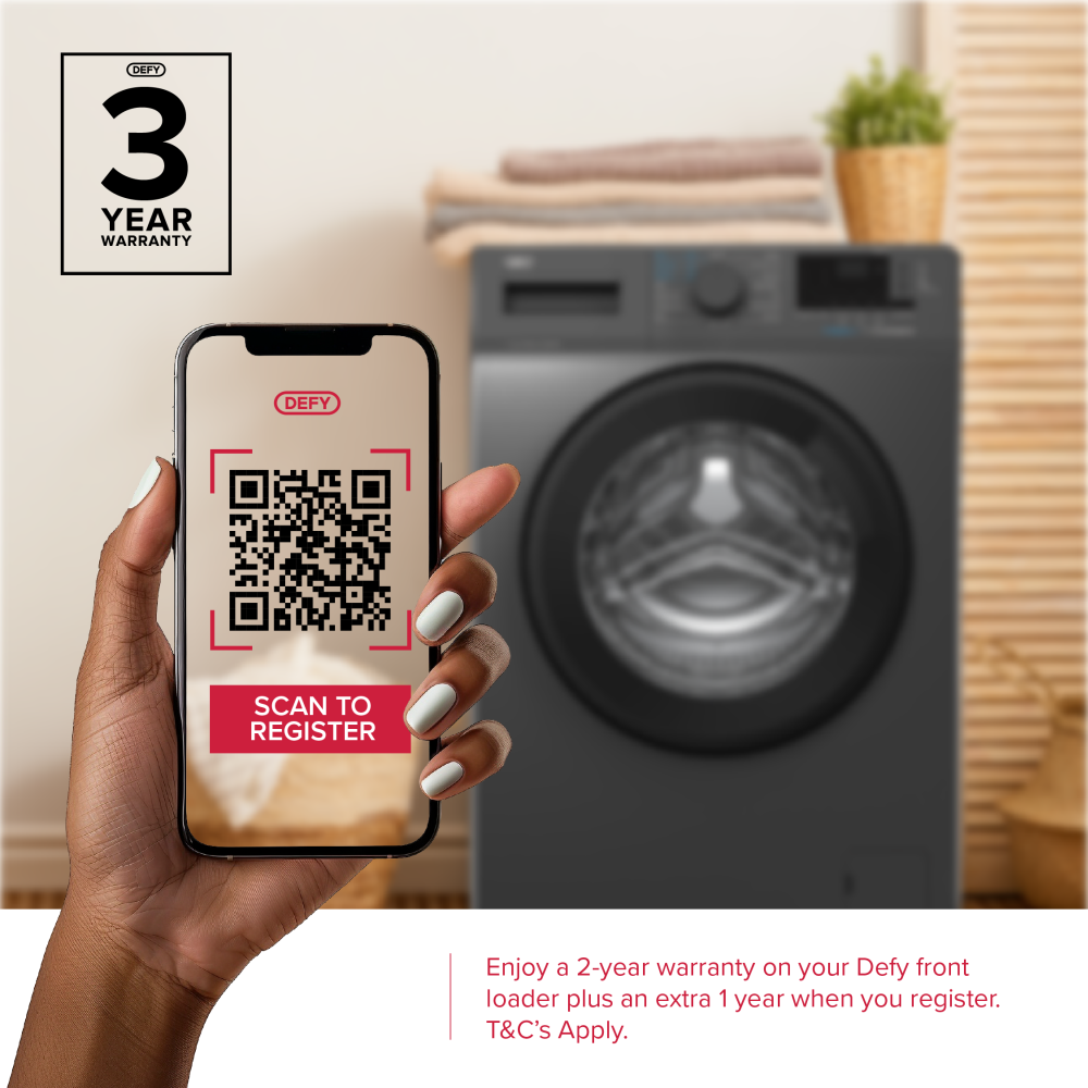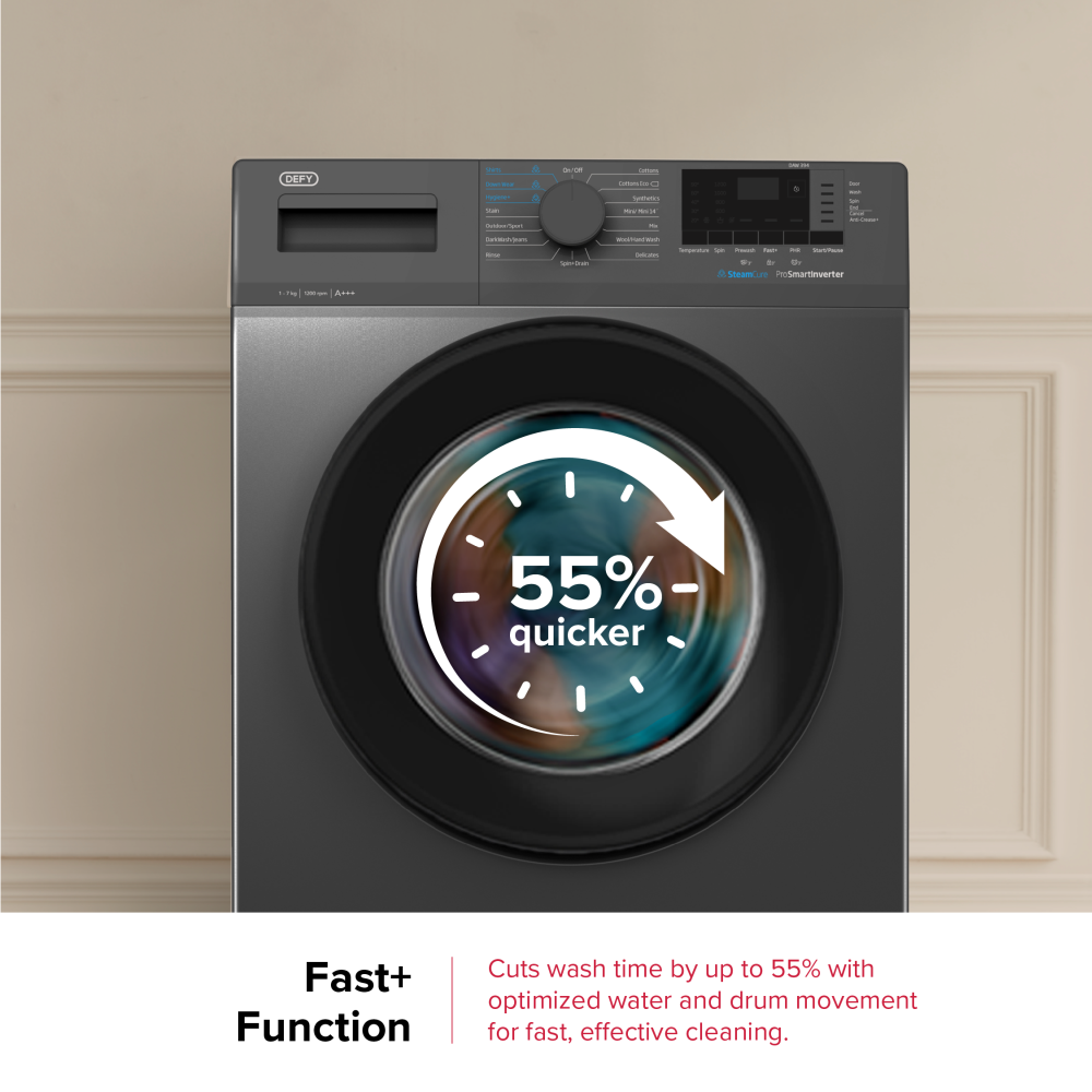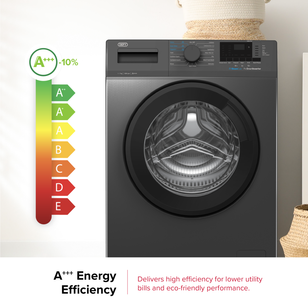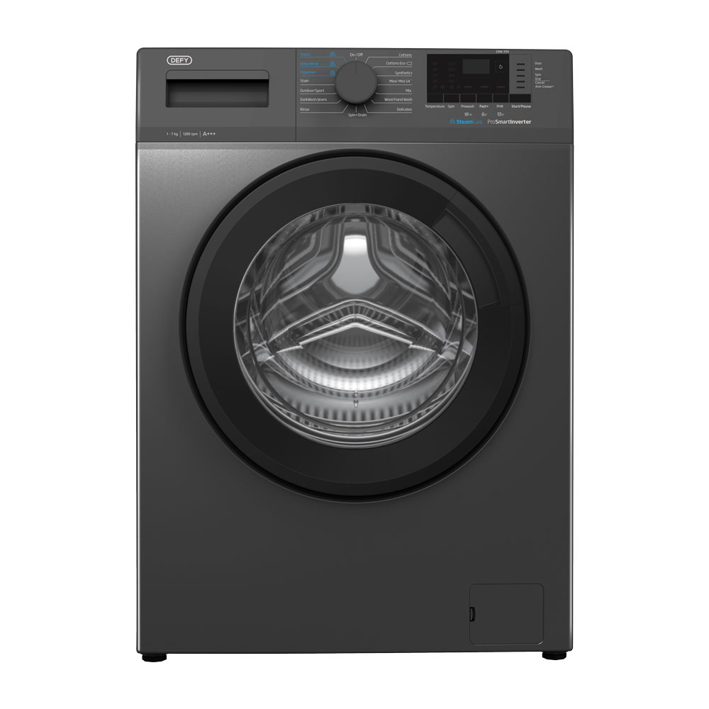 The Defy 7kg Manhattan Grey Front Loader Washing Machine has an A+++ energy rating, 15 programs and it has an integration of SteamCure technology.
