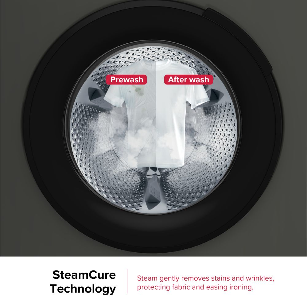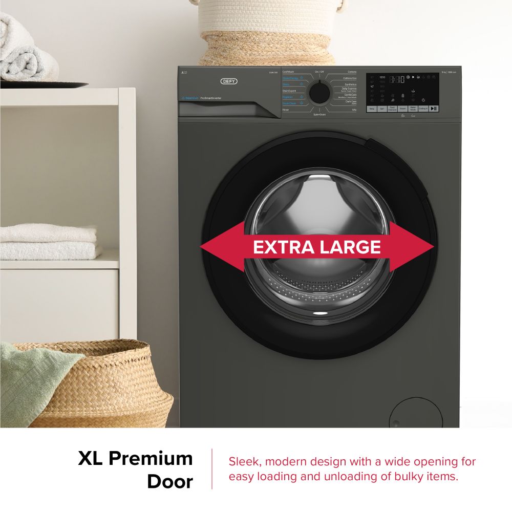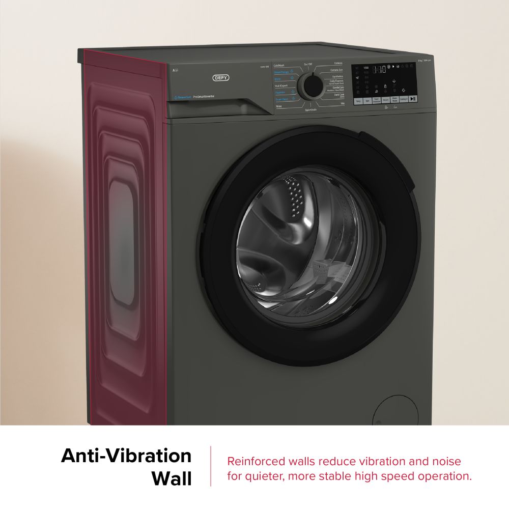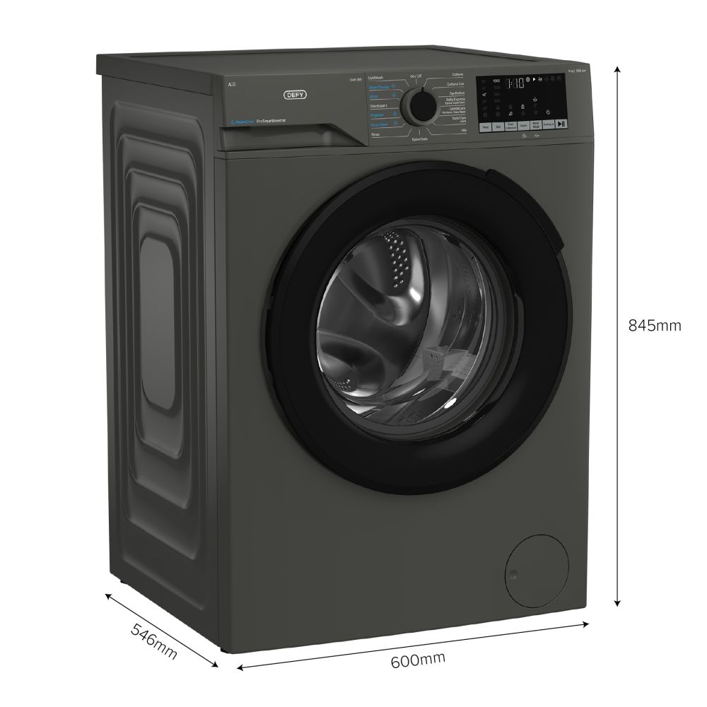 The Defy 12kg Manhattan Grey Front Loader Washing Machine has an A+++ energy rating, 15 programs and it has an integration of SteamCure technology.