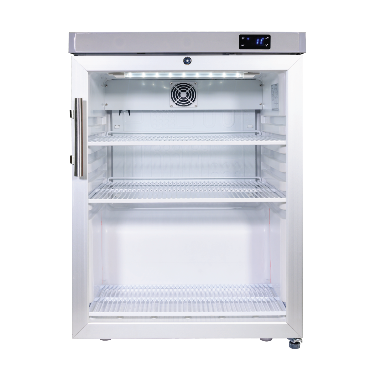 The combination of a tempered glass front, stainless steel accents, and a white finish offers a professional yet refined appearance. This cooler delivers not only in performance but also in aesthetic appeal, creating an inviting display for your beverages.