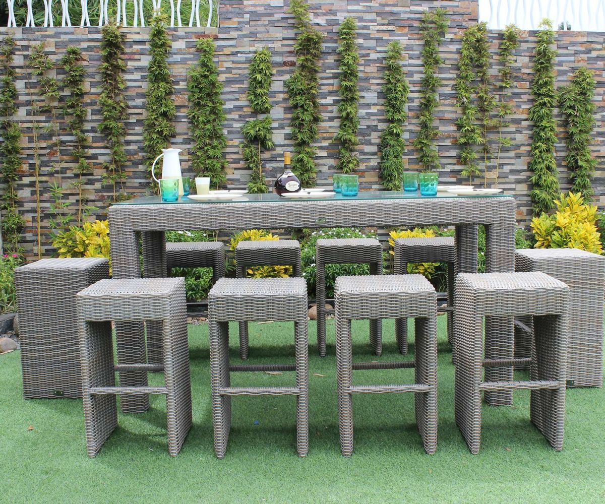 The all-weather materials, including HDPE wicker, make the bar set resistant to sun, rain, and various environmental factors, ensuring that it will maintain its beauty and functionality through changing weather conditions. The sleek and modern design of the set adds a contemporary touch to your outdoor space, creating an inviting atmosphere for both intimate gatherings and larger social events.
